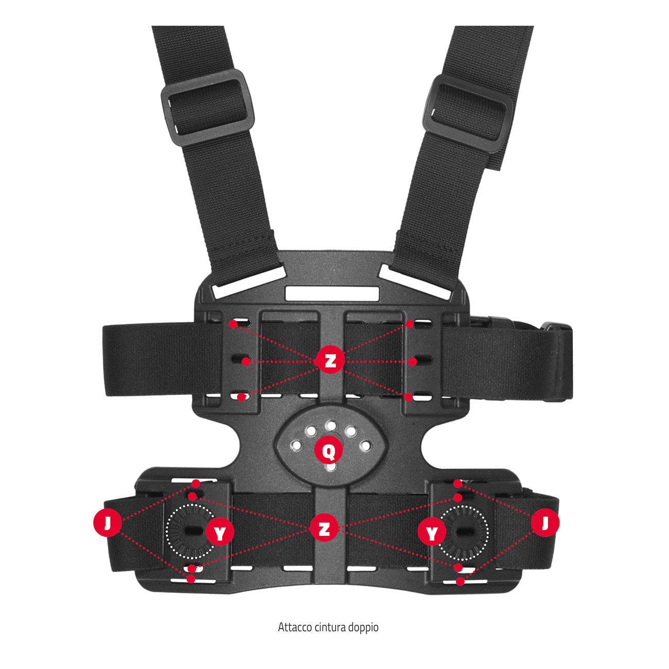 Double bretelles avec rails antidérapants pour l’ancrage à la cuisse. Double extension de tour de cuisse réglable avec boucles pivotantes et fixation par velcro.